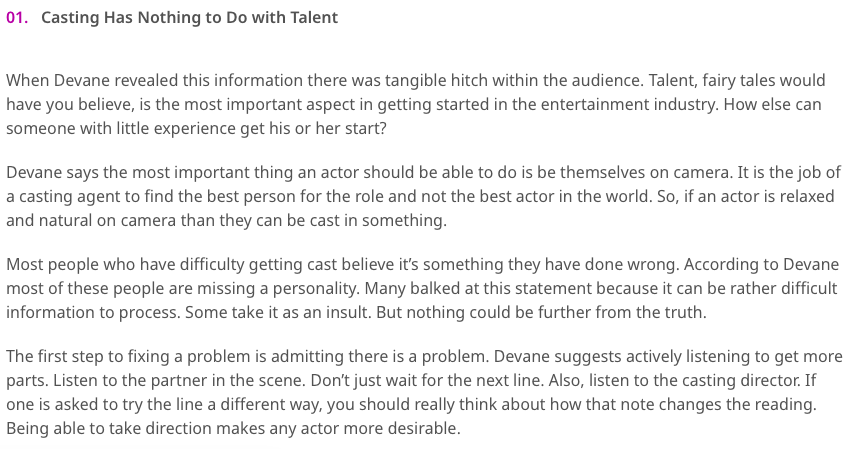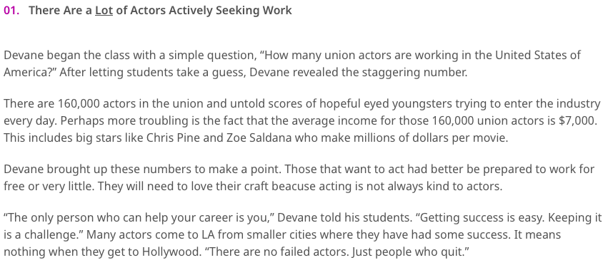 "Working as a professional actor may not be the career you think it is. 90% of beginning actors quit acting in their first two years because of two common misconceptions. First having unrealistic goals, and second a lack of Show Business Knowledge".