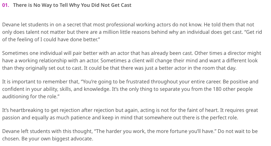 "Casting directors work 14 hour days and do not have time coddle anyone. We are not here to have a good time, we are here to work! We expect the exact same professionalism from actors. Be nice, but be professional which means know the job of an actor, not just the skill-set of acting. If you do not know what to do then learn it! It's not personal it's business"